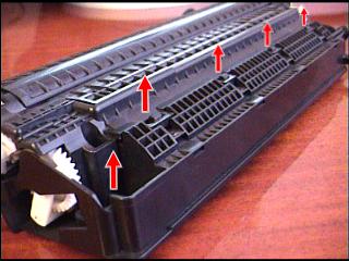 Всю процедуру рекомендую проделать только единожды. Во-первых, как уже было сказано, герметичность поролоновых прокладок с каждой разборкой будет снижаться. Во-вторых, слишком это все муторно. Поэтому, разобрав картридж, можно его слегка доработать, а далее пользоваться плодами своего труда: срезаем часть корпуса в районе расположения пробки от тонера, делаем несколько отверстий на нижней части бункера (обычно три по количеству внутренних отделений) и заклеиваем их скотчем. Проследите, чтобы опилки не остались внутри картриджа.