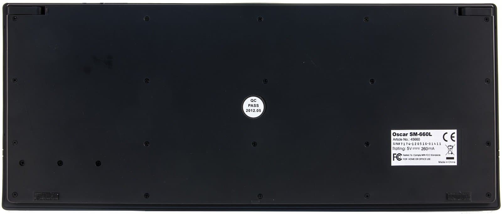 Обычную клавиатуру сложно сделать оригинальной внешне, однако используемый материал и закругленный по краям корпус справляются с этой задачей, под стать коробке, и выглядит Oscar SM-660L дороже своей цены. Усиливает впечатление глянцевая полоса в нижней части, завершающаяся светодиодными индикаторами состояний Num Lock, Caps Lock и Scroll Lock (защитная пленка может быть удалена вместе с рекламной наклейкой, напоминающей о подсветке символов).