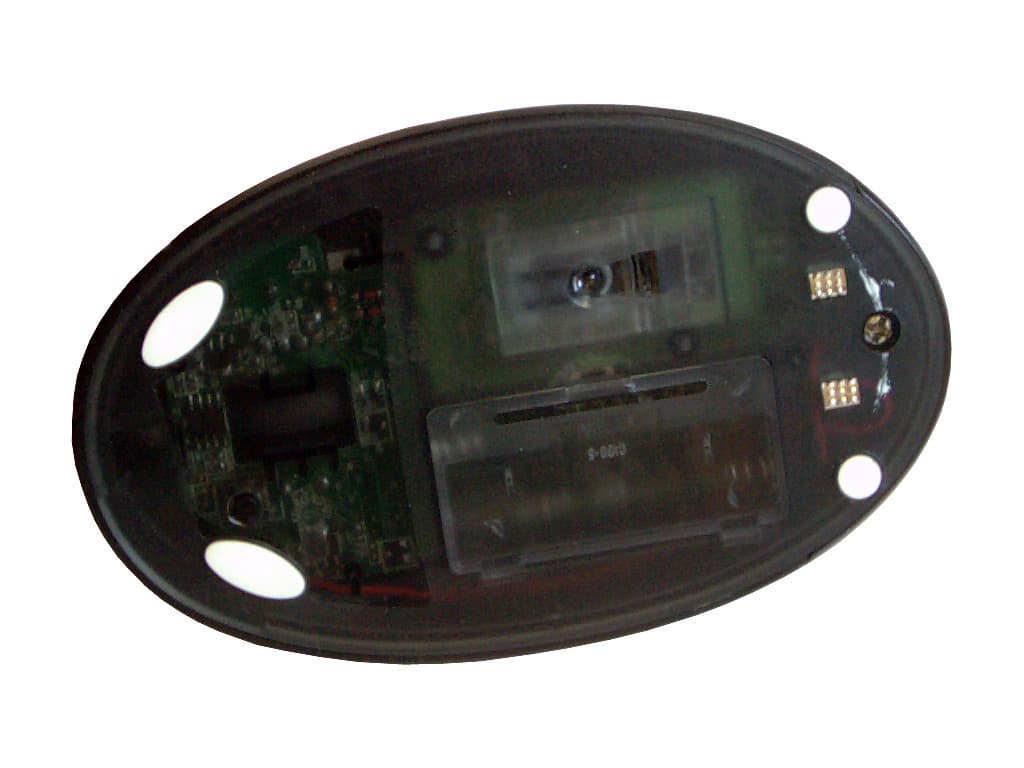 Что касается самой мыши Defender 2210, то она, как я уже писал выше, очень похожа на свою сестру, Defender 2220. При взгляде на верхнюю крышку корпуса заметны только два различия — отсутствие интерфейсного кабеля, что вполне логично, и присутствие светодиода красного свечения. Расположенный перед колесом прокрутки он выполняет функцию индикатора разряда источников питания. Гораздо более серьезные отличия ожидают нас на нижней крышке корпуса Defender 2210. Естественно, в отличие от своей проводной сестры, у данной мыши обнаруживается батарейный отсек и кнопка Connect. Но, больше всего, как мне кажется, на разницу указывает шарик оптико-механической системы. Большинство нас уже давно привыкли к оптическим мышкам и такая конструкция, медленно, но верно уходящая в прошлое, сразу же бросается в глаза. Несколько удивительно, после проводной оптической модели видеть вроде бы ту же мышь, хоть и беспроводную, но не оптической. Говорят, что оптико-механические мыши нравятся любителям компьютерных игр… Да, это правда. Эти мыши заслужили любовь не просто так. Любителям игр, зачастую, нравится их значительный вес. В данном случае вес действительно не самый малый, ибо помимо шарика в Defender 2210 присутствуют элементы питания (2 шт. размера ААА). Но, вот лично у меня вызывает сомнение то, что мышь так уж понравится «игрунам». Ведь именно они чаще всего занимаются так называемым «разгоном» мышек, а как известно, беспроводные радио мыши практически не разгоняются. Обычно, частота обмена данными этих устройств с компьютером оказывается ниже 100Hz, чего любителям игр недостаточно. Но, о результатах тестирования на “разгон” я еще напишу ниже, а пока хотелось бы написать пару слов о питании Defender 2210.