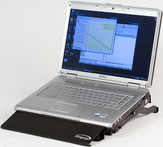 Но наиболее интересным вопросом является работа системы охлаждения. Вообще говоря, производитель нам обещает, что за счет лучшего охлаждения ресурс ноутбука вполне может увеличиться где-то на треть. Проверить это в лаборатории, разумеется, невозможно. А вот оценить эффективность охлаждения вообще — можно. И помогает этому интеллектуальность системы охлаждения современных ноутбуков и собственные уши. Дело в том, что скорость работы вентилятора зависит от температуры внутри корпуса, так что в большинстве моделей при большой нагрузке он быстро выходит на максимальные обороты. Шума при этом достаточно много — и от самого вентилятора небольшого диаметра, и от продуваемого воздуха. Посмотрим, изменится ли картина при использовании AirGear. Для проверки я взял один из домашних ноутбуков от Hewlett Packard, основанный еще на Mobile Celeron 1.7. Данный процессор (который не следует путать с Celeron M!) основан на базе ядра Northwood, т.е. в принципе это «классический» Pentium 4 со всеми его недостатками, включающими и тепловыделение с энергопотреблением. От аккумулятора работает менее часа, а при настольном использовании в режиме максимальной производительности хорошо прогревается даже при небольшой нагрузке, ввиду того (кроме всего вышесказанного), что развитыми функциями энергосбережения процессор не снабжен — в его случае все гораздо хуже, чем даже у «полноценного» Pentium 4-M. В общем, единственной причиной, по которой со «старичком» пока нельзя расставаться, это наличие последовательного и параллельного портов :) Но для нашей цели он вполне подходит — 30 Вт TDP это как раз где-то на уровне современных ноутбучных Core 2 Duo (т.е. то, о чем я говорил выше — вся «продвинутость» современных технологий в плане экономии энергии съедается ростом производительности). Плюс недоразвитое энергосбережение, не позволяющее процессору охлаждаться в простое.