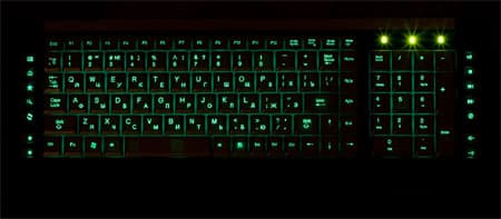 А вот в дорогих была. В самом деле — а зачем нам подсвечивать клавиатуру, если требуется исключительно свечение нанесенных на клавиши символов? Давайте сделаем клавиши непрозрачными, а символы прозрачными. Точнее, клавиши можно делать совсем прозрачными (даже не матовыми), но верх их «накрывать» непрозрачной пластмассой. Всю поверхность, за исключением букв, которые в данном случае и будут светиться. Впервые такой подход был реализован в Logitech G15. Пришелся он по нраву многим пользователям. Но, в основном, зарубежным. Просто потому, что необходимость локализации в компании при разработке устройства учтена не была, так что светились только символы латинского алфавита. Специальные клавиши для русифицированных клавиатур выпускать никто не стал из экономии (не так уж дешево подобные «бутерброды» из разной пластмассы стоят), так что символы кириллицы… наносились простой краской на непрозрачной части клавиш. С учетом того, что последние в G15 вообще не светились, понятно, что различить русские буквы в темноте было никак невозможно. Впрочем, это особенности реализации — Microsoft вот, например, в своем устройстве потребности пользователей, которым нужен отличный от латинского алфавит, учел. И пусть русские буквы на клавишах мелкие, зато светятся.