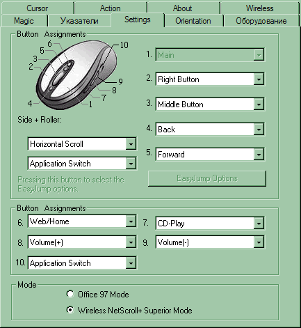 Первая закладка управляет колесиком прокрутки. Ничего особо интересного тут нет — привычный набор настроек. Замечу кстати, что в «родном» режиме мышь прекрасно прокручивает и неактивные окна, что так нравится очень многим пользователям. Особенно это удобно в тех случаях, когда вы читаете что-то большее во время выполнения длительного процесса, уверенного в том, что свой индикатор следует в обязательном порядке держать на переднем плане (чаще всего этим страдают программы для работы со сканерами).