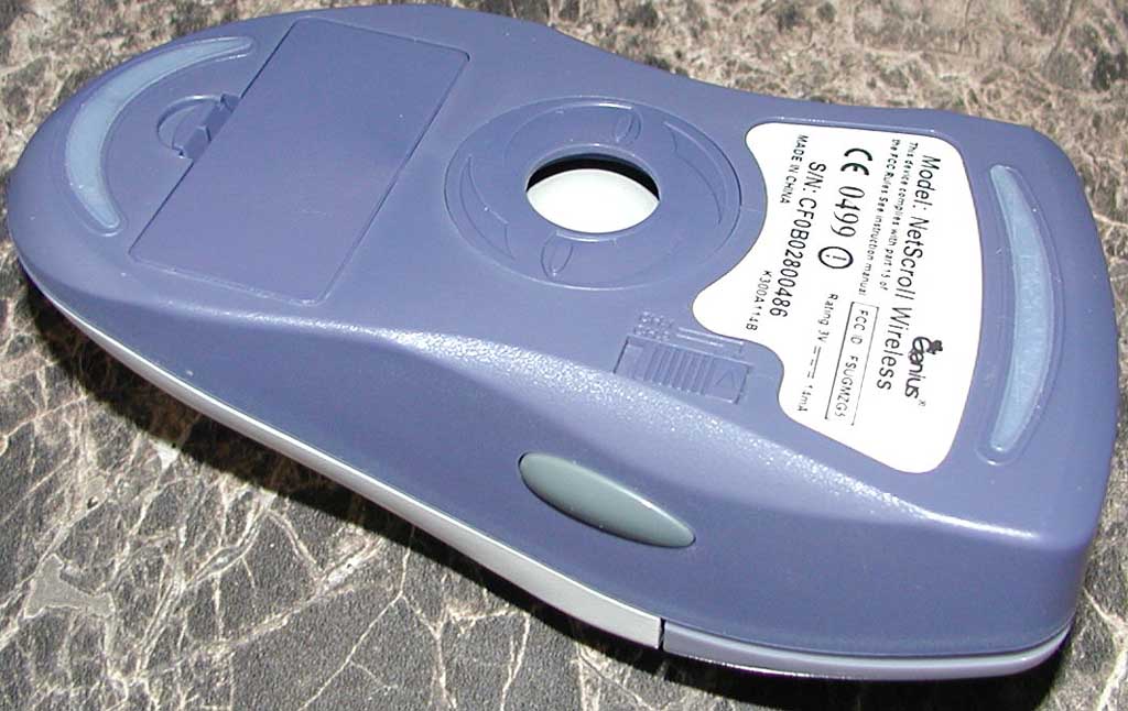 Теперь посмотрим на мышь. То, что это именно NetScroll, видно сразу: те же изгибы корпуса, то же колесико. Однако отличия от базовых проводных моделей (оптических или оптомеханических) есть и немалые: в стандартный корпус батарейки и приемопередатчик никак не поместятся. Поэтому новая мышь имеет большие размеры (127 × 65 × 38 мм) и массу. Из-за больших габаритов немного подкорректировали и форму, в результате чего мышь стала несколько более "кривой", нежели базовая модель.