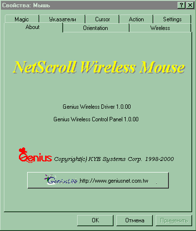 Следующая закладка — "About". Из нее, кстати, можно узнать о том, что текущая версия драйверов и программного обеспечения имеет номер 1.0.00. Это меня несколько напугало (вспомнил, сколько крови такой же номер версии попортил во времена NewScroll Wireless), однако вскоре выяснилось, что работает все ничуть не хуже, чем ПО для остальной серии NetScroll (версия 4.16.00). С этой закладки, кстати, можно отправиться прямиком на сайт компании Genius.