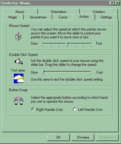 Кроме того, на этой странице можно выбрать режим функционирования мыши: "Office 97" или "Wireless". В первом случае колесико прокрутки будет поддерживаться только в специально рассчитанных на это программах, во втором (тоже, кстати, меняет название в зависимости от версии софта) везде.