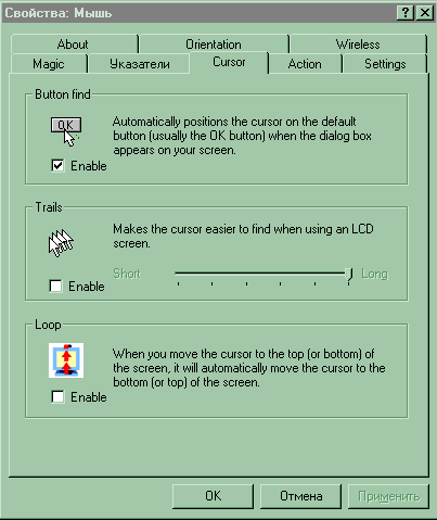 Закладка "Cursor". Во-первых, позволяет включить или выключить "поиск кнопки" (во включенном состоянии при открытии диалогового окна курсор будет автоматически перемещаться на кнопку по умолчанию). Во-вторых, можно настроить длину "хвоста" за курсором или просто выключить его. Полезно разве что если вы будете подключать мышь к старому ноутбуку: при работе за современным LCD (не говоря уже о CRT) монитором это абсолютно не нужно. Ну и функция "Loop", "склеивающая" края экрана — при попытке переместить курсор, например, за правый край, он появится из-за левого.