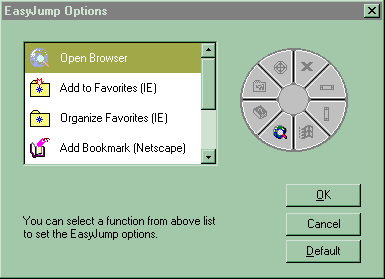 Итак, EJ представляет собой круглую панель из восьми кнопок, а вызывается она на экран нажатием одной из кнопок (какой — настройте сами). С ее помощью можно быстро произвести следующие действия: открыть справку по использованию мыши и софта, изменить свойства мыши, запустить режим AutoPan (когда перемещения мыши вызывают не движение курсора, а прокрутку документа; очень важная вещь для "колесных" мышей, менее нужная для использующих джойстик или "качельку"), закрыть текущее приложение, переместить курсор на горизонтальную или вертикальную полосу прокрутки, открыть меню "Пуск" и переместить в него курсор. Действие, выполняемое восьмой кнопкой, выбирается пользователем из списка.