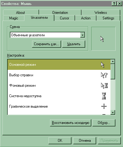 Следующая закладка наверняка известна всем. И не мудрено: она стандартна для Windows и позволяет выбрать внешний вид курсоров мыши.