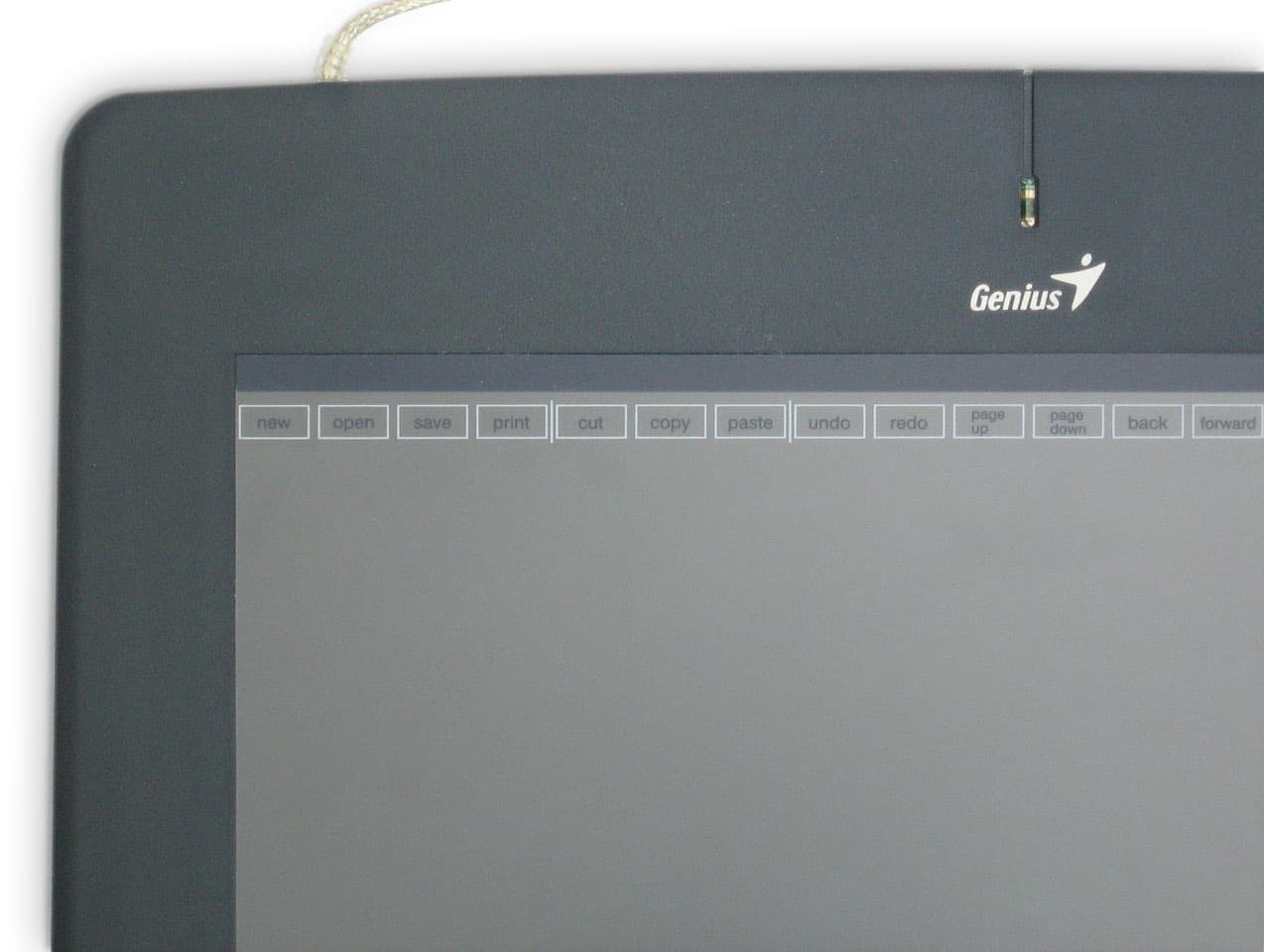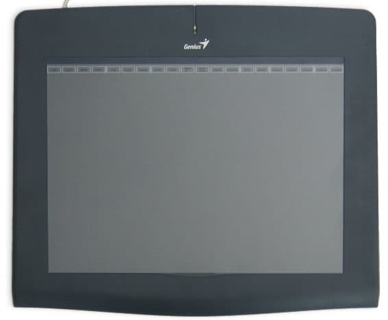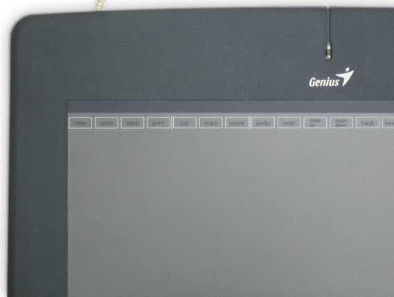 Сам планшет довольно громоздкий (37 х 34 см). Кроме чувствительной области (как уже было сказано, чуть больше листа формата А4) можно отметить только зеленый светодиод, загорающийся при контакте с пером или мышью. Нет ни кнопок, ни колесика. Чувствительная область покрыта пленкой, под которую можно подложить лист бумаги. Пленка закреплена в верхней части и отгибается на манер книжного листа.