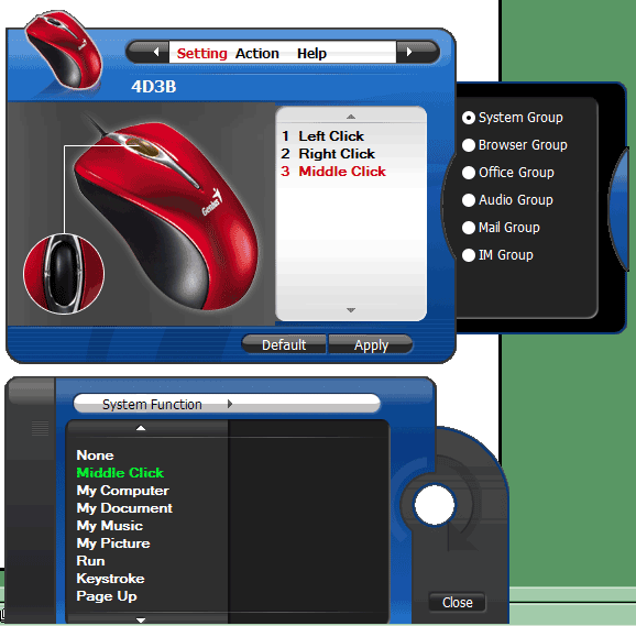 Если выбрать какую-нибудь кнопку, то ее можно настроить. Для данной цели из нашего основного окна красиво выедет две панели инструментов. В одной нужно выбрать группу действия (всего их шесть), в другой — его самого. Подробнее назначение кнопок, пожалуй, будем изучать когда в руки попадет модель с большим их количеством — тут всего три, так что можно и штатную настройку оставить. Даже лучше так будет.