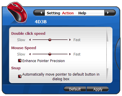 Если закладка Setting управляла кнопками мыши, то обязанности Action — настраивать поведение курсора. Тут ничего нового, по сравнению со стандартными настройками, не нашлось. Про Help же вообще говорить не имеет смысла — назначение очевидно из названия.