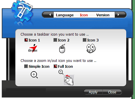 Вообще слово «наворотила» подходит к данному продукту как нельзя лучше — программа совсем не похожа на строгие закладки штатного мышиного апплета, да и на округлые, но строгие обводы SetPoint тоже. Хотя большую часть времени живет себе в системном лотке, в глаза не бросаясь, но… Чего только стоят три скина основного окна, из лотка вызываемого :) Отличаются только цветом. При помощи основного окна можно поднастроить программу, сменить скин, сходить на сайт Genius или настроить мышь. Причем последних может быть одновременно более одной подключено — для программы это не помеха.