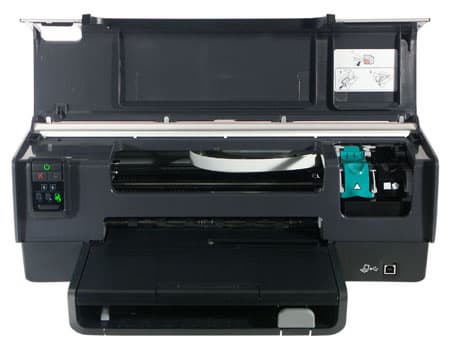 Сам блок кнопок расположен на корпусе принтера, а не на крышке. Крепление крышки выполнено очень удобно. Имеется механический микролифт или попросту замедлитель. Если бросить крышку, то сильного удара не будет — механика погасит скорость. Еще одна особенность заключается в автоматическом включении принтера при открытии крышки. Удобство это или недостаток, сказать сейчас трудно, наверное, и то, и другое. По крайней мере, проводить смену картриджа (картриджей) весьма удобно, учитывая, что замена проводится непосредственно в месте парковки.