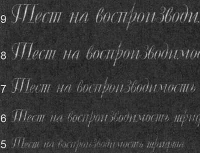 Хуже принтер справляется с печатью декоративного шрифта вывороткой, различить буквы меньше шестого кегля уже трудно, остальные же (6-10) имеют вид явно залитого текста.