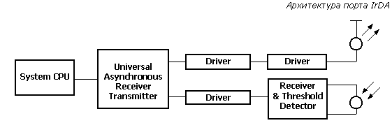 Сам порт IrDA основан на архитектуре коммуникационного СОМ-порта ПК, который использует универсальный асинхронный приемо-передатчик UART (Universal Asynchronous Receiver Transmitter) и работает со скоростью передачи данных 2400–115200 bps.