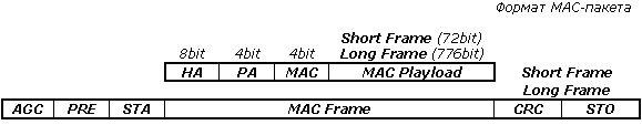 Физический уровень обеспечивает передачу данных, закодированных по схеме модуляции последовательными импульсами 16-PSM (Pulse Sequence Modulation — 8 слотов, где только 2 или 4 могут содержать импульс) со скоростью 75Kbps. Однако, при использовании такой схемы кодирования, импульс означает "1", его отсутствие — "0". Частота несущей основного сигнала — 1.5MHz с минимальной дальностью действия 5м. Данные пересылаются в пакетах двух видов: длинные (776bit) и короткие (72bit), структура которых абсолютно идентична за исключением значения стартового флага, а также разрядности контрольной суммы. Так, протокол MAC (Media Access Control) регламентирует процессы взаимодействия множественной периферии с единственным основным устройством (Host) и обмена информацией между ними.