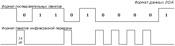 Рассмотрим физические основы IrDA. Передающую часть. Байт, который требуется передать, посылается в блок UART из CPU командой записи ввода-вывода. UART добавляет старт-стоп биты и передает символ последовательно, начиная с младшего значения бита. Стандарт IrDA требует, чтобы все последовательные биты кодировались таким образом: логический "0" передается одиночным ИК-импульсом длиной от 1.6m s до 3/16 периода передачи битовой ячейки, а логическая "1" передается как отсутствие ИК-импульса. Минимальная мощность потребления гарантируется при фиксированной длине импульса 1.6m s.