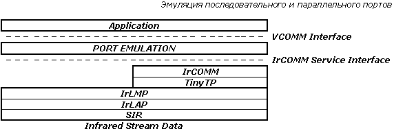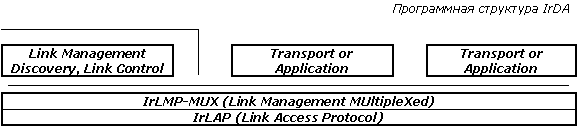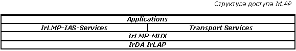 Программный протокол. Он включает в себя: IrLAP (Link Access Protocol), занимающийся разбиением данных на блоки, контролем ошибок и другими функциями низкого уровня, и IrLMP (Link Management Protocol), позволяющий по одной ИК-линии обмениваться данными между несколькими приложениями. Данный протокол базируется на существующих стандартах асинхронной полудуплексной передачи данных HDLC и SDLC. Инфракрасная технология поддерживает только однонаправленную передачу информации, поэтому, в следствие полудуплексной природы SIR, возникла архитектура с одним главным (первичным) и множественными подчиненными (вторичными) устройствами. Схема обращения устройств представляет собой обычный протокол обмена данными, где есть фазы запросов (Request) и ответов (Response). Так, первичное устройство отвечает за организацию соединения, обработку ошибок, и посланные им фреймы называются управляющими (Command Frames), а пакеты вторичных устройств именуются ответными (Response Frames). Обмен информацией идет только с первичным устройством, которое всегда выступает инициатором соединения, однако его роль может играть любое из устройств, поддерживающих необходимые для этого функции. По желанию может быть включен протокол транспортного уровня, позволяющий осуществлять контроль передачи между приложениями в случае одновременной работы нескольких приложений на одной физической линии. Для разных уровней имеется три интерфейса. Служебные примитивы уровня LM-SVC позволяют одному из устройств IrDA узнать какие сервис и протоколы зарегистрированы на другом устройстве. Примитивы доступа к уровню M-SVC управляют режимом связи, открытием и закрытием независимых соединений между клиентами, а так же отправкой и приемом данных. Интерфейс L-SVC дает доступ к функциям протокола IrLAP.