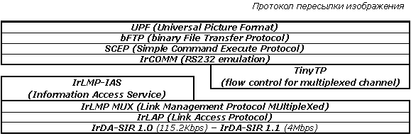 Стандарт IrDA включает в себя стек протоколов трех согласованных обязательных уровней: IrPL (Physical Layer), IrLAP (Link Access Protocol) и IrLMP (Link Management Protocol).
