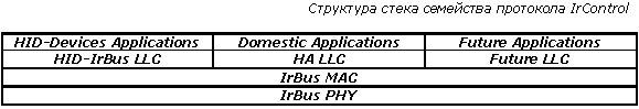 IrBus (IrControl). Спецификация, регулирующая вопросы, связанные с подключением различной периферии, требующей взаимодействия с системными контроллерами. Ее положения применимы также к устройствам удаленного управления ПК, телевизорами высокой четкости (HDTV) и бытовыми приборами.