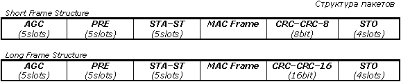 Максимальный квант передачи может быть равен 100, 200 или 500 ms. Он представляет собой максимальное время, в течение которого устройство передает данные до того, как перейдет к прослушиванию подтверждения приема и зависит от скорости передачи, емкости буфера в принимающем устройстве. Минимальная длительность передачи определяется неспособностью передающего устройства перейти к приему данных сразу после выдачи последнего бита. Дело в том, что усилитель PIN-диода в передающем устройстве входит в состояние насыщения от собственной передачи. Время восстановления приемника — переменная величина, составляющая 0.001–10 ms. Этот параметр для данного устройства должен быть заранее известен и учитывается в фазе переговоров об установлении соединения. Процедуры расширенного восстановления включают в себя функцию сброса, которая прерывает связь, но потом восстанавливает активное состояние с параметрами соединения, используемые по умолчанию.