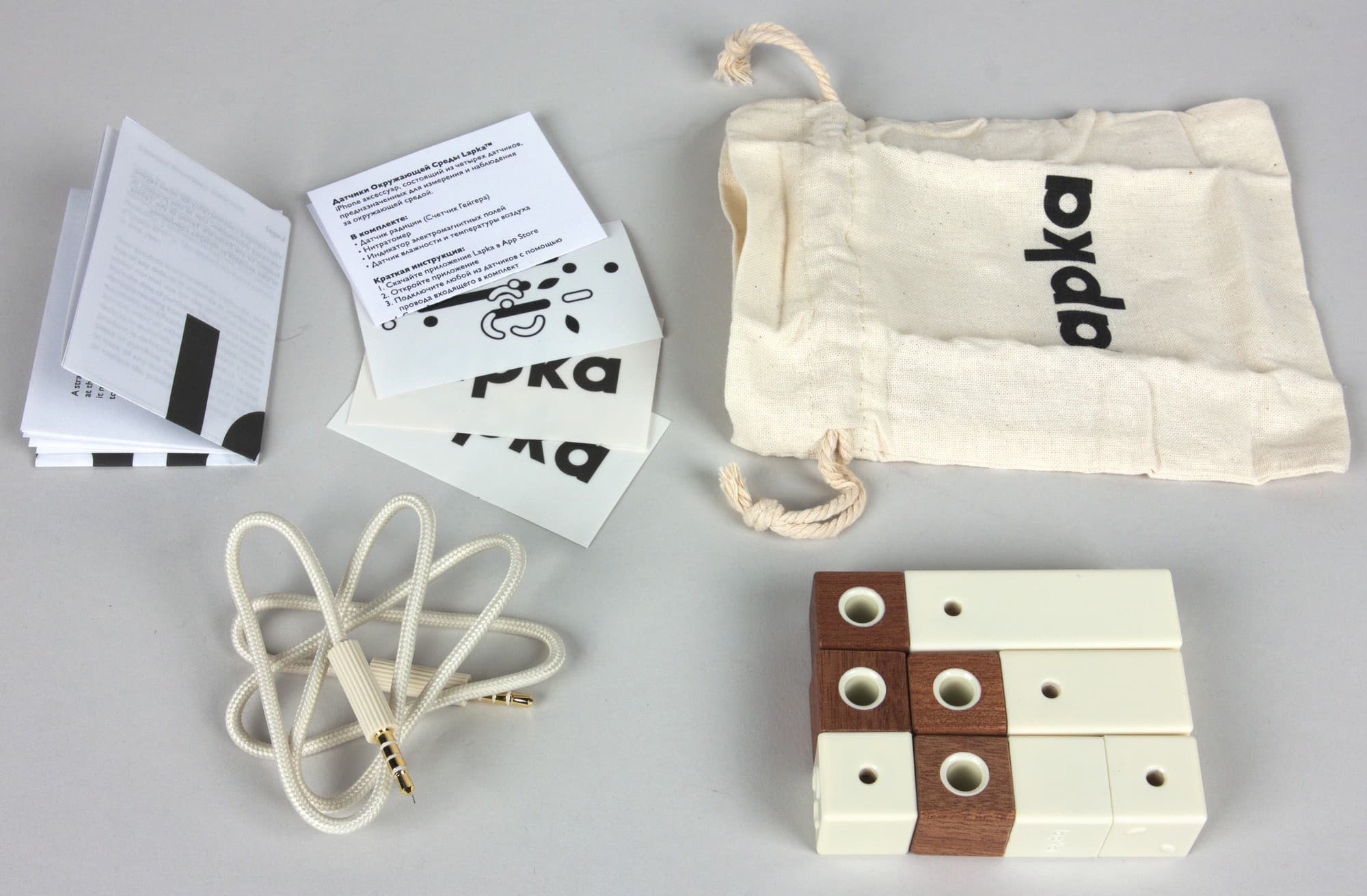 Под датчиками сложен надежный кабель в текстильной оплетке для подключения к устройствам Apple, а также мешочек для транспортировки, инструкции и наклейки.