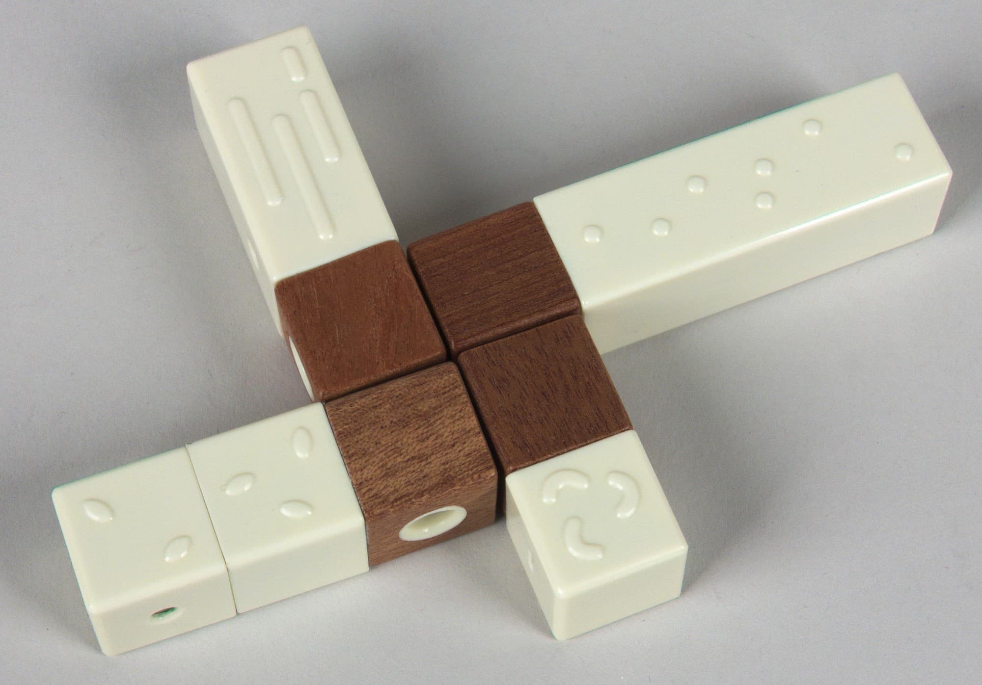 Различать компоненты приходится по нанесенным на них рельефным символам. Датчик с точками измеряет радиационный фон. Датчик с палочками — уровень электромагнитного излучения. Самый маленький, с «орешками кешью» — температуру и влажность. «Детектор кунжутных зерен» определяет содержание нитратов в продуктах.
