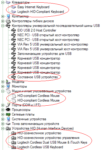 Главным в этом списке является «Составное USB-устройство», засветившееся также в группе «Устройства HID» как «Logitech Cordless Dual USB Mouse & iTouch Keys». Данное устройство, в свою очередь, порождает еще HID-устройства — клавиатуру и две мыши (одна из которых «привязана» к клавиатуре — почему так, будет рассказано ниже). В конечном итоге, цепочка «раскручивается» до уже привычных клавиатуры и мыши. Это совсем не похоже на два типичных устройства в случае использования портов PS/2, но оно работает и реально требует всего один порт. Что, собственно, и требовалось получить :)