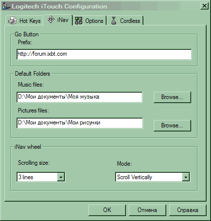 Несложно догадаться, что предназначена она для настройки дополнительной панели, расположенной в левой части клавиатуры. Что можно настроить? Во-первых, имя сайта, которое будет по умолчанию в строке ввода в диалоге, появляющемся при нажатии на кнопку Go (сам диалог был приведен ранее). Наилучшим вариантом будет вписать сюда наиболее посещаемый сайт для того, чтобы отправляться на него нажатием всего двух кнопок — Go и сразу Enter (ну а на другие сайты можно переходить, набрав путь в строке ввода). Следующий блок предназначен для определения каталогов My Pictures и My Music в панели iNav (тоже приводилась выше). По умолчанию выбирается вариант стандартный для Windows, однако никто не мешает вам выбрать совершенно другие каталоги (можно даже не содержащие музыку или картинки — лишь бы была необходимость иметь возможность открывать их совершив минимальное количество телодвижений :)). Ну а нижний блок предназначен для настройки колесика: в каком направлении будет осуществляться прокрутка (по вертикали или по горизонтали) и с какой точностью. Выбрав прокрутку по вертикали, вы получите замену «мышиного» скроллера, что мне кажется очень удобным (не всегда хочется отрывать руки от клавиатуры), ну а другой вариант позволит вам прокручивать документы в двух направлениях сразу, причем несколько более удобным образом, чем в «двухколесных» мышах от A4 Tech.