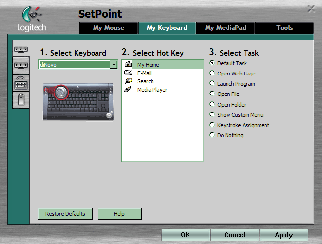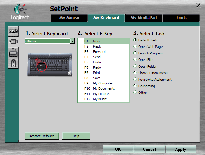 Поскольку дополнительных кнопок немного, можно заняться настройкой части основных, а именно функционалками: подобно многим другим моделям, в diNovo реализован режим F-Lock, меняющая значение этих двенадцати клавиш. Более того — изначальный вариант их назначения (судя по маркировке) теперь стал дополнительным, но, к счастью, после включения компьютера в текущей версии софта по умолчанию работает все-таки он (обратный подход порядком «достал» пользователей других клавиатур Logitech). Клавиши органично распределяются на три группы. Первая (из четырех левых клавиш) предназначена для работы с электронной почтой: новое письмо, ответ, пересылка и отправка. Вторая группа работает с текущими документами и умеет отменять последнее действие или возвращаться к нему (Undo/Redo), а также распечатывать и сохранять текущий документ. Третья четверка клавиш открывает стандартные папки: «Мой компьютер», «Мои документы», «Мои рисунки» и «Мою музыку». В общем-то, не так уж мало, к тому же изменить назначение клавиш можно, да и по своему первоначальному назначению в наше время они используются не очень часто, но я бы предпочел наличие именно дополнительных кнопок для выполнения подобных функций, не отменяя и возможность переназначения функциональных клавиш.