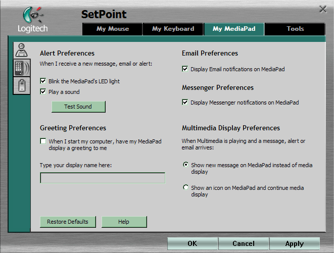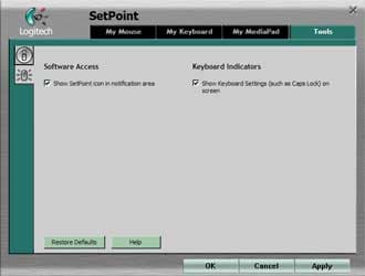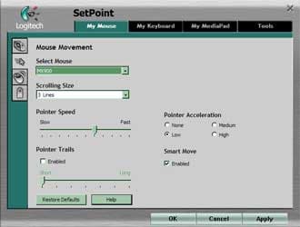 Что в SetPoint удобно по сравнению с предыдущими разработками, так это то, что все настройки можно совершить на одной панели, не используя для клавиатуры и мыши две разные программы (лучше бы Logitech по примеру большинства компаний научился помещать настройки в стандартные апплеты «Панели управления» для клавиатуры и мыши). Система навигации в результате двухуровневая: верхние табы выбирают группу настроек (мышь, клавиатура, MediaPad и общие), левые — конкретную страничку для данного устройства.