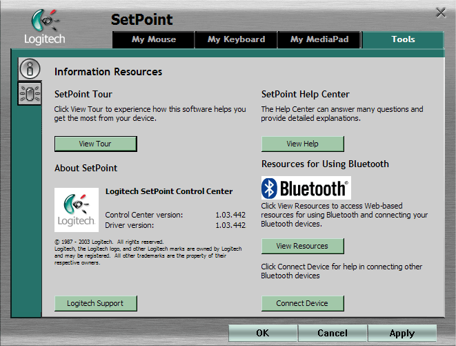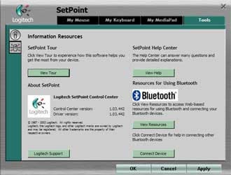 Четвертая группа настроек не привязана к какому-либо из устройств комплекта. Первая страница информационная: с ее помощь можно перейти к ознакомлению с возможностями SetPoint или к полной версии помощи к программе, увидеть его текущую версию, сходить на страницу поддержки Logitech или посмотреть ресурсы, посвященные Bluetooth. Впрочем, есть здесь и одна «рабочая» кнопка, позволяющая начать процесс подключения какого-либо стороннего Bluetooth-устройства (я по-привычке использовал базовые возможности WIDCOMM).