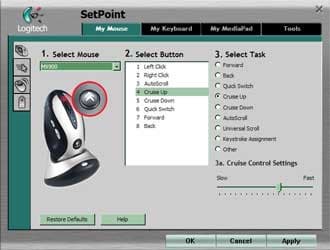 Первая страница первой группы позволяет настроить кнопки мыши. Возможности настройки знакомы по MouseWare и хорошо видны на скриншоте. Из новшеств — разве что возможность настройки скорости прокрутки при помощи кнопок CruiseUp/CruiseDown, которая может оказаться весьма полезной. А вот другой «подарочек» от первых версий SetPoint иначе как вредительством не назовешь: вплоть до версии 1.03, которой я и пользовался, третью, четвертую и пятую кнопку мыши можно было настраивать как угодно за одним исключением — нельзя было заставить их функционировать как третья, четвертая или пятая кнопка мыши! Для двух последних это терпимо, поскольку их стандартные функции в SetPoint реализованы, а вот лишившись третьей, я проклял все на свете буквально через полчаса использования мыши — как только решил побродить по сети. К счастью, в вышедшей непосредственно перед Новым годом версии 1.04 эту проблему решили, позволив настраивать эти три кнопки как «Generic button», в результате чего SetPoint не пытается модифицировать их работу, но пример весьма показательный.