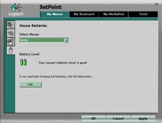 Последняя страница предназначена для контроля состояния элементов питания. Впрочем, постоянно на нее заходить необязательно: в случае разряда вас об этом предупредят всплывающим окном, да и красный светодиод на мыши будет мигать (все как и у МХ700). Есть такая страница и у самой клавиатуры и MediaPad, причем наиболее полезна она для клавиатуры: как и мышь, Pad может предупредить о низком уровне заряда и самостоятельно (только уже при помощи ЖК-дисплея), а вот клавиатуре доступна только программная индикация.