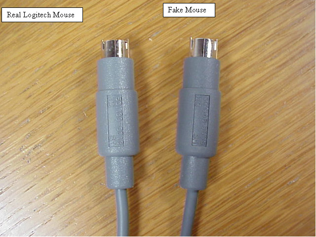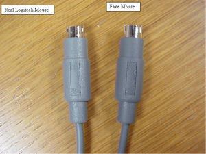 Как видите, корпус разъема оригинальных мышек Logitech гораздо изящнее прямоугольного корпуса подделок. Все это очень странно, ибо в былые времена, никакой разницы в форме корпусов интерфейсных разъемов между оригинальными мышками и подделками не существовало. В качестве свидетельства тому, можно привести фотографии из аналитического материала Logitech, в котором некогда рассматривалась мышь Logitech Pilot Mouse PS/2 (M-S35) и ее подделка.