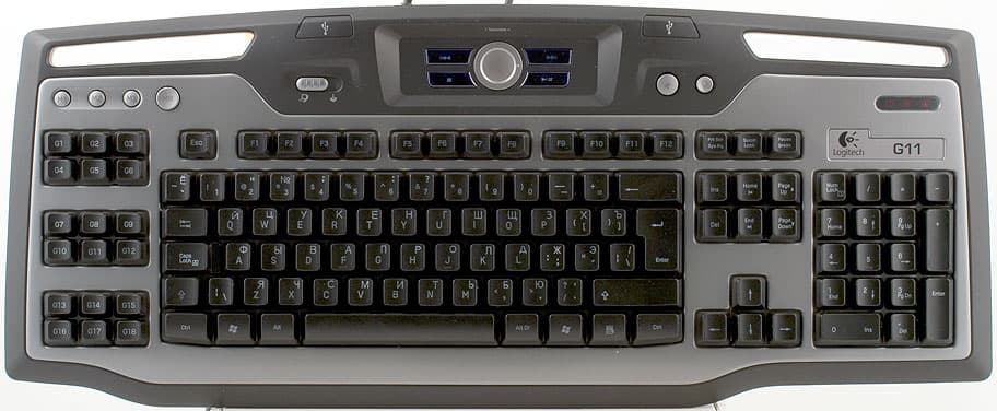 Впрочем, вернёмся к нашим кнопкам. Затем над основным блоком идёт ползунковый переключатель «игрового режима», по сути просто блокирующий Win клавиши. Далее — транспортная панель для управления плеерами и громкостью. Она реализована совсем по-разному. У G11 вокруг поворотного регулятора звука расположены четыре кнопки. Именно кнопки, с коротким ходом и жёстким нажатием. Сам регулятор без ограничителей, но вращается приятно и весьма удобен. Далее у обеих моделей кнопка отключения звука и последняя — для управления подсветкой (два уровня яркости), завершают ряд индикаторы Lock на своих привычных местах, но в виде пиктограмм на единой панели.