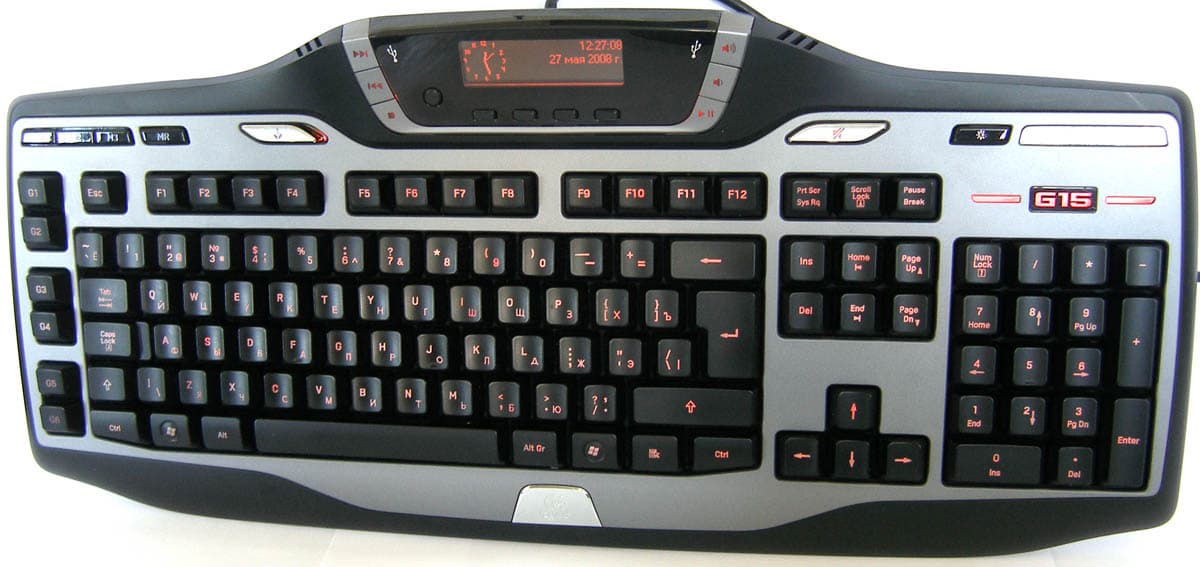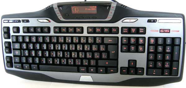 У модели G15 присутствует маленький ЖК-дисплей, на котором могут отображаться всяческие якобы полезные сведения. В стандартном комплекте сразу же запускаются конечно же часы, индикаторы загрузки памяти и процессора, сведения о проигрываемом треке и извещения о свежих письмах. В игре это может быть и полезно, но лично мне точно не надо. Как игрушка для настроек и просмотра результатов вполне сгодится. Впрочем, для него написано достаточное количество «апплетов» (или всё же «прилад»?) для использования в играх и других программах, поддерживается Vista Side Show. Так что, по всей видимости, не для всех такой дополнительный мини-дисплей бесполезен. Основной приятной особенностью поддержки является то, что Logitech сотрудничает с производителями игр и другого ПО для расширения ассортимента работающих с этим экранчиком утилит. А владеющие программированием могут написать свои приложения с его использованием. Вокруг экрана размещены шесть кнопок транспортной панели, а под ним пять для управления его параметрами. Левая вызывает меню настроек, остальные служат для навигации по нему.
