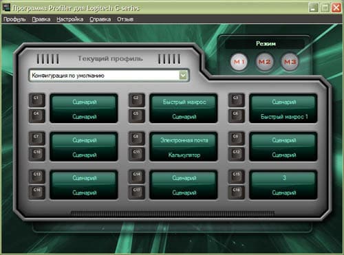 Да, для этой серии не нужен SetPoint. Все медийные кнопки не подлежат перенастройки. Да это в общем-то и правильно — при наличии очень гибко настраиваемых дополнительных клавиш лучше оставить им стандартные функции. А вот как раз наборы настроек для G создаются из этой программы. Принцип её действия настолько же примитивен, насколько и эффективен. Выбираем M набор, выбираем G клавишу, и назначаем на неё любую стандартную клавишу, сочетания их или здесь же записываемый макрос. Удивительно, но это одна из немногих программ, понимающая макросы с модификатором Win, которые обычно жёстко блокируются системой.