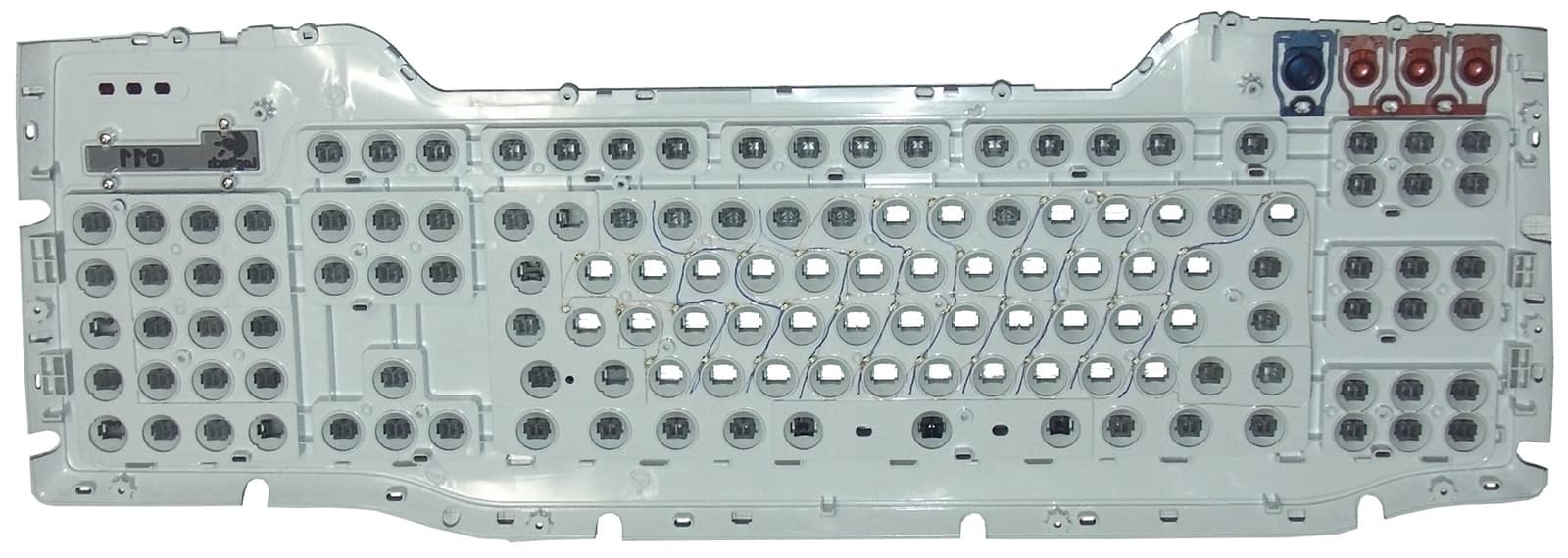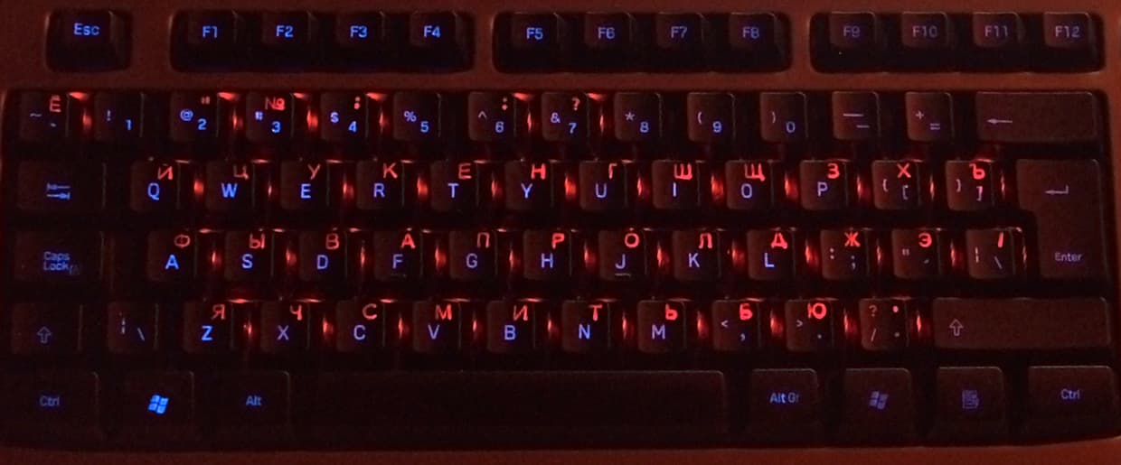 Изучив устройство клавиатуры, мы пришли к выводу о возможности добавления подсветки для символов национальной раскладки. Основная подсветка производится светодиодами через толстый рассеиватель, закрытый отражателем. Направить основной свет на боковую сторону клавиш не получилось. Выбранное решение позволяет добавить подсветку национального алфавита отдельным цветом, что позволяет еще и индицировать выбранную раскладку.