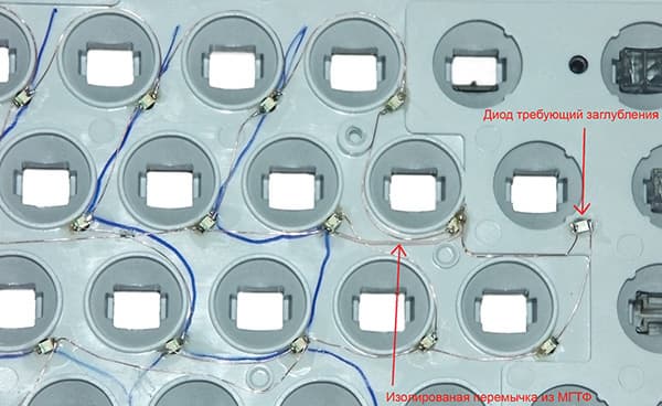 В тех местах, где шины пересекаются, используйте изолированный провод МГТФ. Выведите провода питания подсветки и проверьте ее работу от источника напряжения 5 В. В случае если какая-то из пар светодиодов не горит, проверьте монтаж и полярность. Если ошибки нет, замените эти светодиоды, возможно, вы их перегрели при пайке.