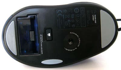 Снизу находится лазерный сенсор ближе к передневнутренней стороне, наклейка с выходными данными, отсек для картриджа с грузиками и кнопка для его извлечения. Две большие и третья меньше «лапки» изготовлены из политетрафторэтилена.
