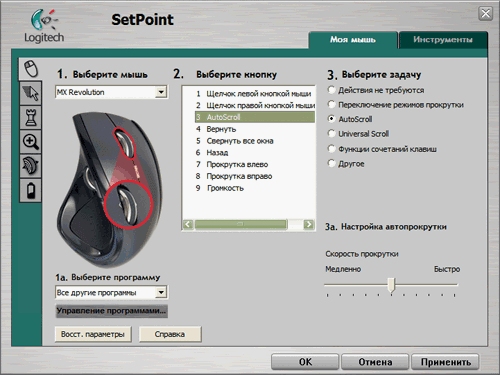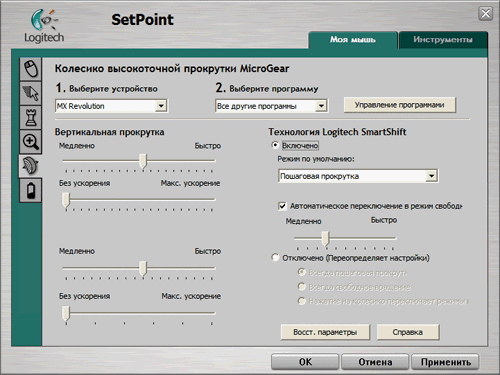 Во время эксплуатации использовались версии 3.1 и 3.3 под Windows XP и под Vista. «Сырость» драйвера проявляется для MX в той же степени, как и для VX. Подробно ПО описано в обзоре VX , скажем лишь об особенностях. Прежде всего, они касаются колёс. Для главного появляется настраиваемое переключение на режим плавной (и быстрой) прокрутки и выбор базового режима работы. Несколько отличаются назначаемые действия и настройки.