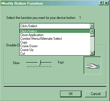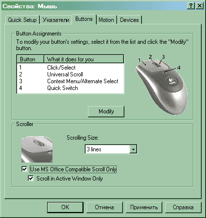 Вторая закладка стандартна для Windows, а вот третья наиболее интересна — она управляет кнопками и колесиком прокрутки. Что касается колесика прокрутки, то здесь все достаточно просто, хотя интересной возможностью является прокрутка в неактивном окне, а вот с кнопками свободы много. Любой кнопке (левая не исключение, в отличие от драйверов многих других производителей) можно сопоставить любое из присутствующих в списке действий. Некоторые считают недостатком MouseWare невозможность сопоставить кнопке мыши произвольную комбинацию клавиш клавиатуры, однако, на мой взгляд, предопределенных вариантов более чем достаточно для 90% пользователей.
