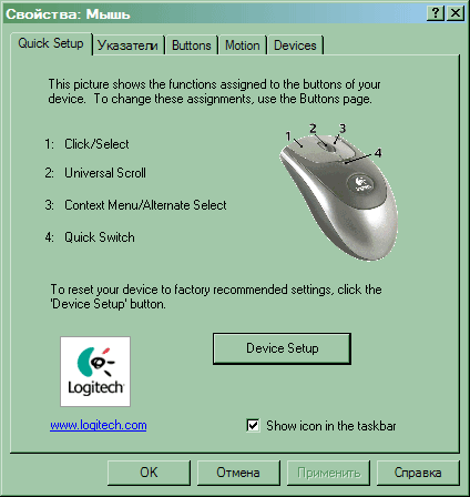 Первая закладка в основном информационная. На ней показаны текущие привязки функций к кнопкам мыши, изменить которые можно при помощи закладки «Buttons», а сбросить на заводские умолчания — нажав на кнопку «Device Setup». Здесь же можно включить или выключить отображение значка для быстрого доступа к MouseWare в системной области панели задач. Большой необходимости в нем нет, да и выглядит он непритязательно — просто мышь (это вам не следящие за курсором глаза от Genius :)), так что для экономии места в системной области (куда нынче и без того лезут все, кому не лень) лучше сие выключить.