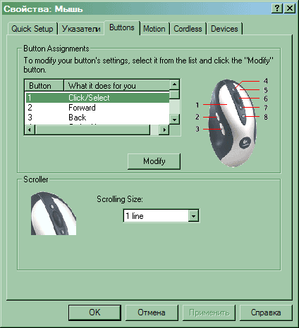 Следующая закладка является стандартной для Windows, а вот следующая родная закладка MouseWare (Buttons) претерпела некоторые изменения. Настройка кнопок осталась той же (только кнопок больше доступно для настройки), а вот настройки скроллера стали более бедными — режим совместимости с Microsoft Office теперь включен по-умолчанию и выключить его никак. Самым заметным побочным эффектом этого стала невозможность использовать прокрутку в неактивном окне (впрочем, если вы без этого жить не можете, то стоит воспользоваться утилитой типа X Mouse).