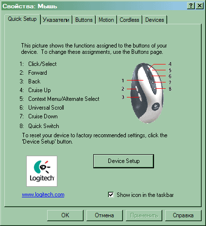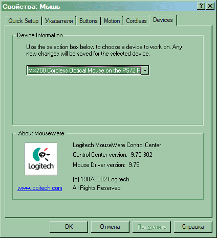 Последняя закладка чисто информационная — номер версии MouseWare да тип подключенной мыши (в стандартном списке устройств все «грызуны» от Logitech выглядят одинаково).