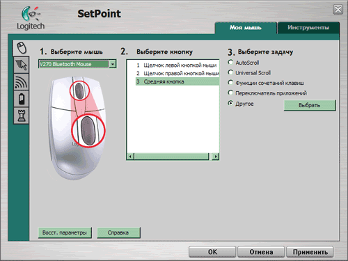 Решение странное — мышь все-таки всего лишь трехкнопочная, так что могла бы работать и без дополнительного программного обеспечения. Возможности настройки в данном случае все равно не требуются — кнопок слишком мало. Если бы дали возможность индивидуальной настройки кнопок под отдельные приложения (как в случае MX610) какая-то польза, может быть, и появилась бы, однако по приведенному выше скриншоту видно, что этого не наблюдается. В наличии всего лишь стандартные возможности SetPoint для трехкнопочных мышей.