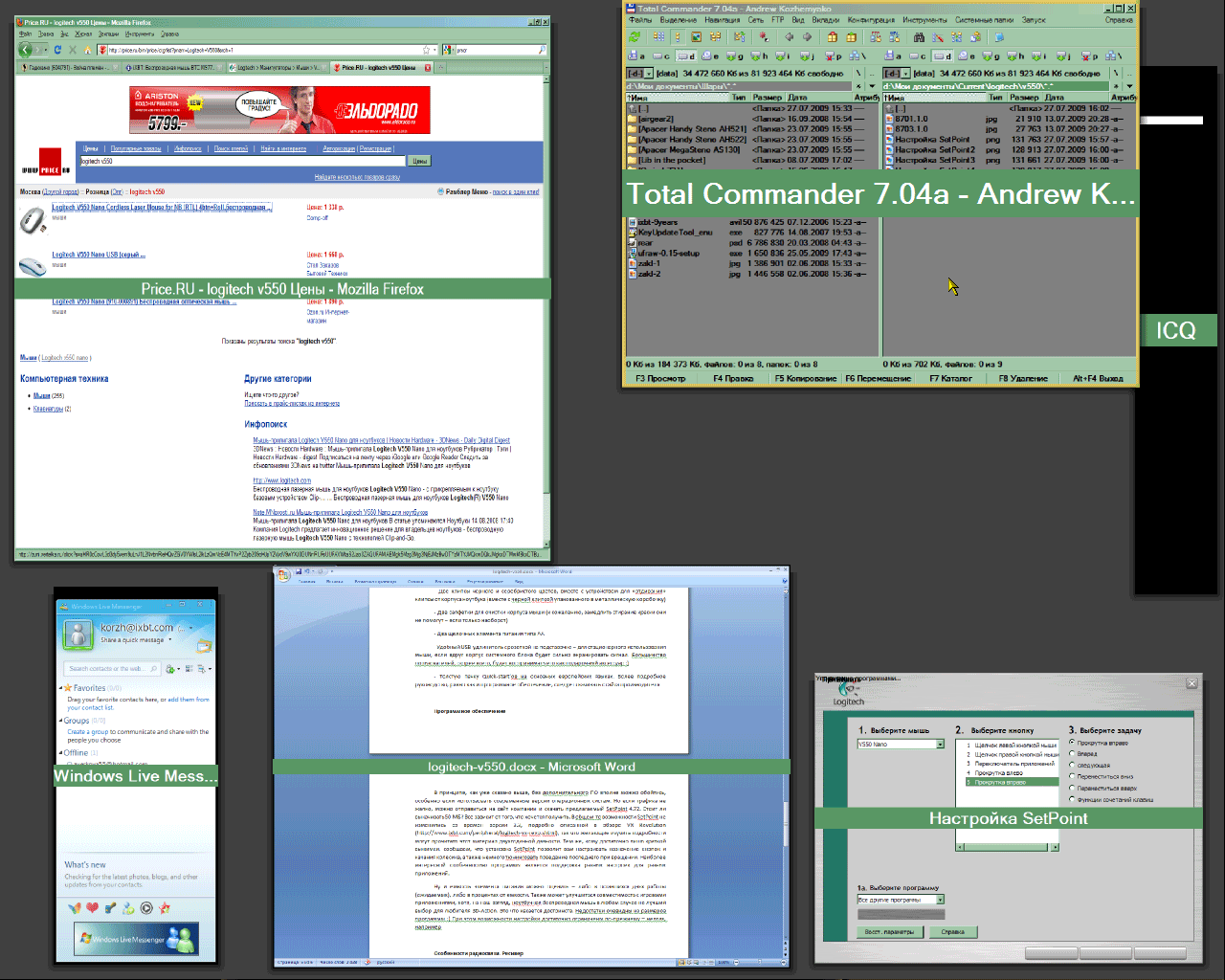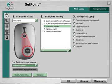 В принципе, как уже сказано выше, без дополнительного ПО вполне можно обойтись, особенно если использовать современные версии операционных систем. Но если трафика не жалко, можно отправиться на сайт компании и скачать предлагаемый SetPoint 4.72. Стоит ли выкачивать 50 МБ? Все зависит от того, что хочется получить. В общем-то возможности SetPoint не изменились со времен версии 3.3, подробно описанной в обзоре VX Revolution, так что желающие изучить подробности могут прочитать этот материал двухгодичной давности. Тем же, кому достаточно лишь краткой выжимки, сообщаем, что установка SetPoint позволит вам настраивать назначение кнопок и качания колесика, а также немного тюнинговать поведение последнего при вращении. Наиболее интересной особенностью программы является поддержка разных настроек для разных приложений.