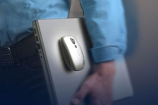 Процесс транспортировки мыши вместе с ноутбуком, по замыслу компании, выглядит так, как это показано на фотографии. Это действительно удобно — если нужно нести только ноутбук и мышь, то одна рука у нас остается полностью свободной. Хоть из конференц-зала в конференц-зал переходи (а то и переезжай) с ноутбуком под мышкой, не говоря уже о простом передвижении по квартире. А если есть еще какие-то вещи, их можно второй рукой транспортировать. Так что идея, конечно, очень простая, но достаточно здравая. Не всем такое нововведение потребуется, однако кому-то нужно, тот не останется обиженным .