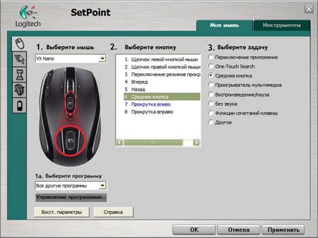 Никаких сюрпризов SetPoint новой версии в себе не таит, посему привожу лишь один скриншот. Как уже говорил, кнопочку за колесом можно назначить на эмуляцию средней кнопки, роль которой обычно выполняет нажатие на колесо. А вот появление для боковых наклонов колеса и дополнительных кнопок функции управления громкостью звука можно только приветствовать. В целом набор опций не такой богатый, как для топовых моделей, но для этой мыши вполне достаточный. За подробным описанием драйвера отсылаю к обзору большой сестры, VX Revolution.